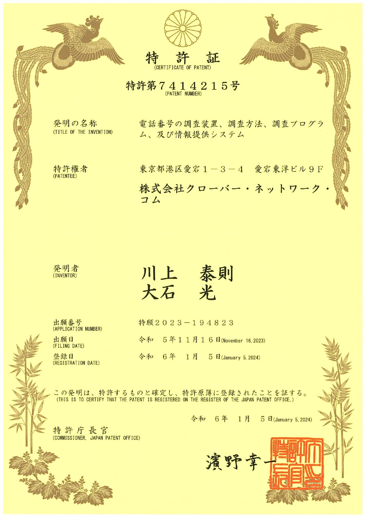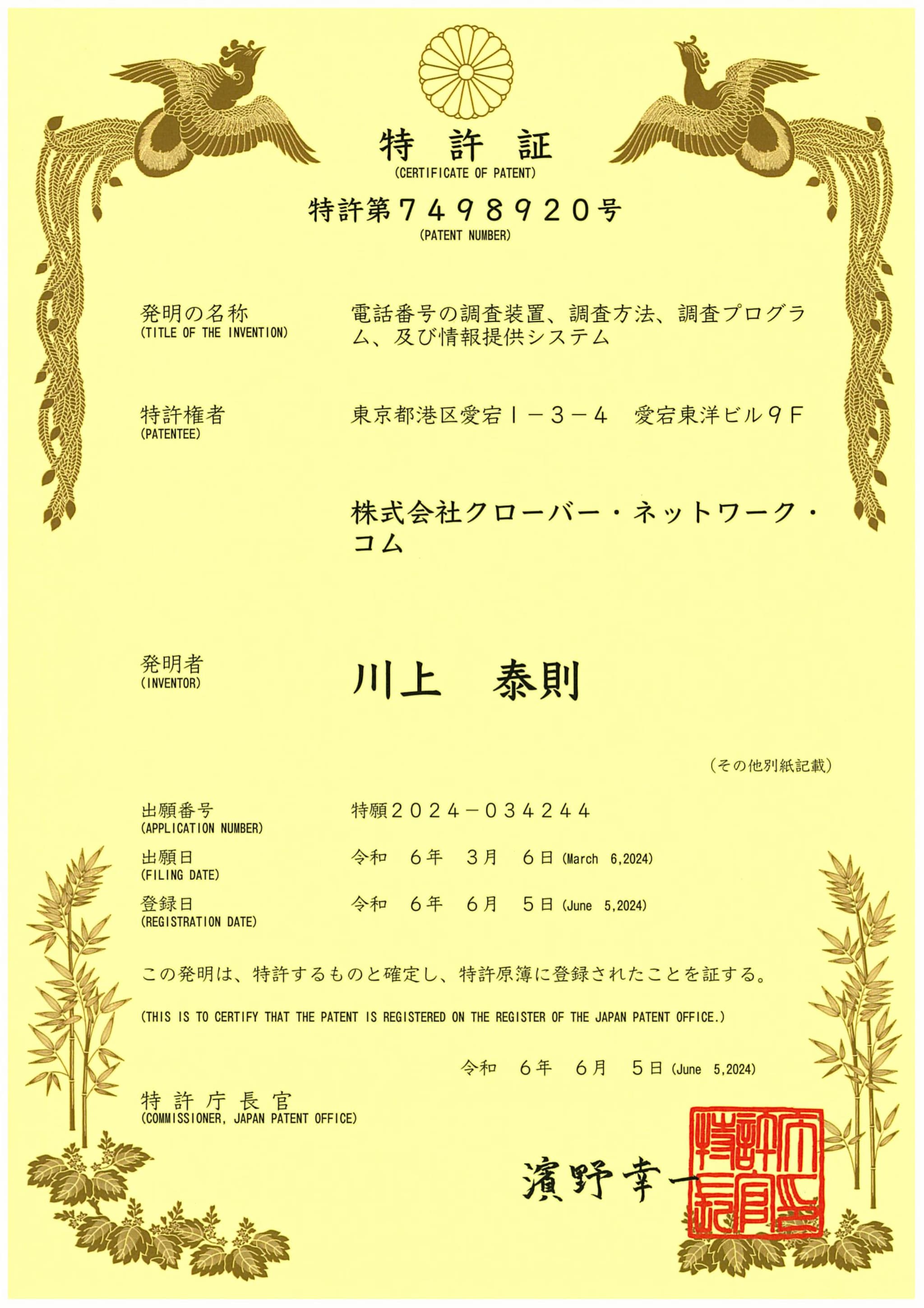 (新しい電話番号発信調査装置に関する特許)
