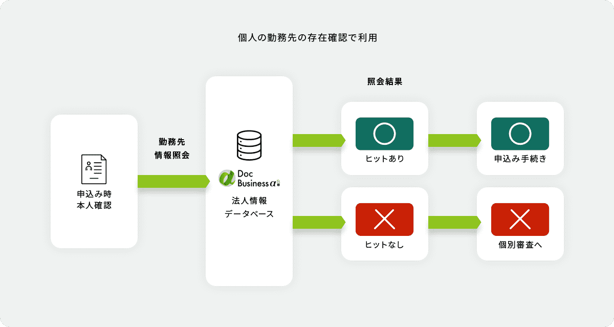 自社で簡単・スピーディに検索できる、不正申込み検知のためのソリューション。初期審査での勤務先・法人確認に利用することで、総合的・多角的に実態を把握して、取引リスクを回避します。